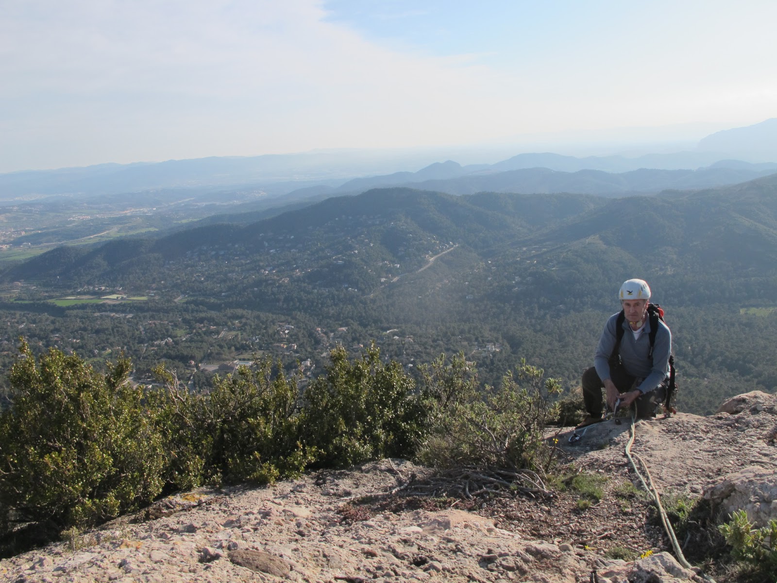 Disfruto recuperant el llarg, el tram del començament té bona presa però tira enrrera sobretot al tram del pitó, haig de fer equilibris per retirar un Àlien que ha poosat a la dreta del tot en una fisura, per sota l'espit. Ja al pany de paret final al.lucino amb la roca, això és una altra cosa! pas atlètic de sortida protegit per una baga a una sabina i ens reunim: quin replà més idílic! que agradable! sense pressa anem plegant el material gaudint de l'airet i les vistes sobre Montserrat, hem disfrutat molt la via i aquí som a casa, ens hi trobem be, molt be.