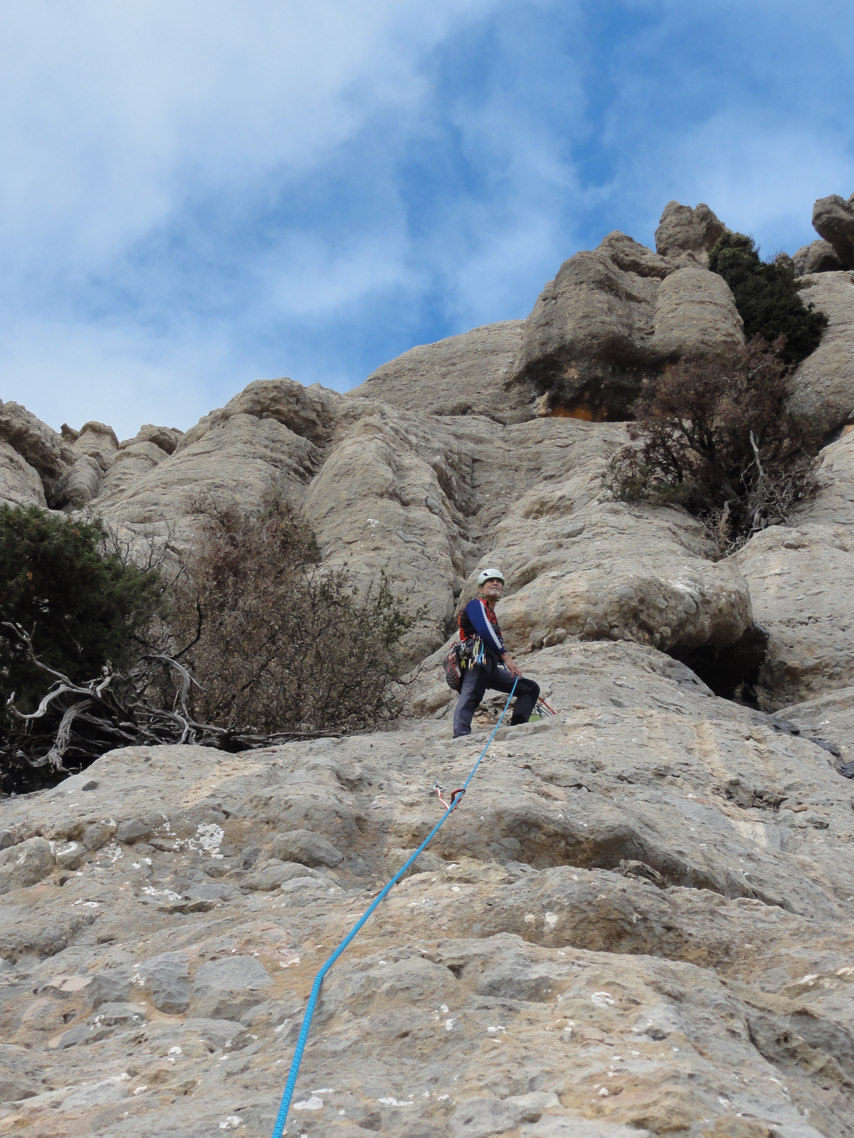 La primera tirada és la més potent de grau, no pas la més obligada però. S'hi posa el Josep; al començar haurem de negociar amb una roca amb poc canto i amb progressió potent i delicada. Superat el rètoil de la via entrem a un terreny que ens obliga a deixar el diedre i anar per l'esquerra, l'equipament tot i ser un luxe obliga escalar. |