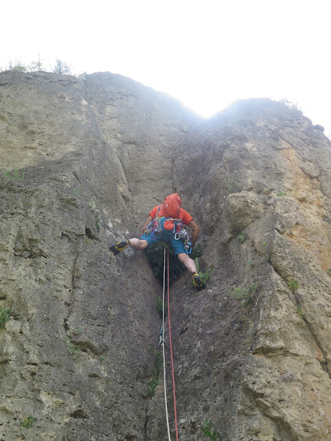 | Després de superar el primer diedre, entrant al segon més vertical i treballós. |